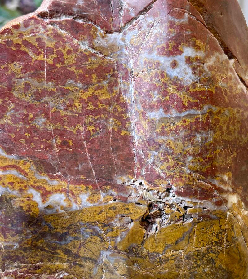 This gorgeous Morgan Hill Poppy Jasper specimen is a one-of-a-kind natural wonder, showcasing rich reds, warm golds, earthy browns and ethereal white veining in a mesmerizing, organic pattern. Featuring natural fissures that tell the story of its geological formation and a light “velvet” polish, this piece maintains its raw, untamed beauty while exuding a subtle, refined sheen.