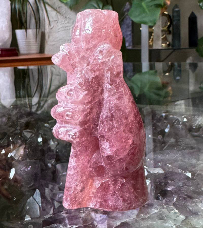 A strawberry quartz carving of a hand holding a rose weaves these symbols into one luminous message: