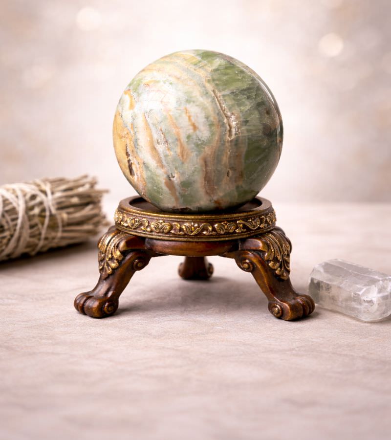 Grounding & Protection: While pistachio calcite is uplifting, it also has grounding properties that help stabilize energy. The sphere’s shape enhances this effect, providing a steady flow of energy that helps keep you grounded while shielding you from negative influences. It fosters a sense of security and protection, allowing you to feel calm and supported in any space.