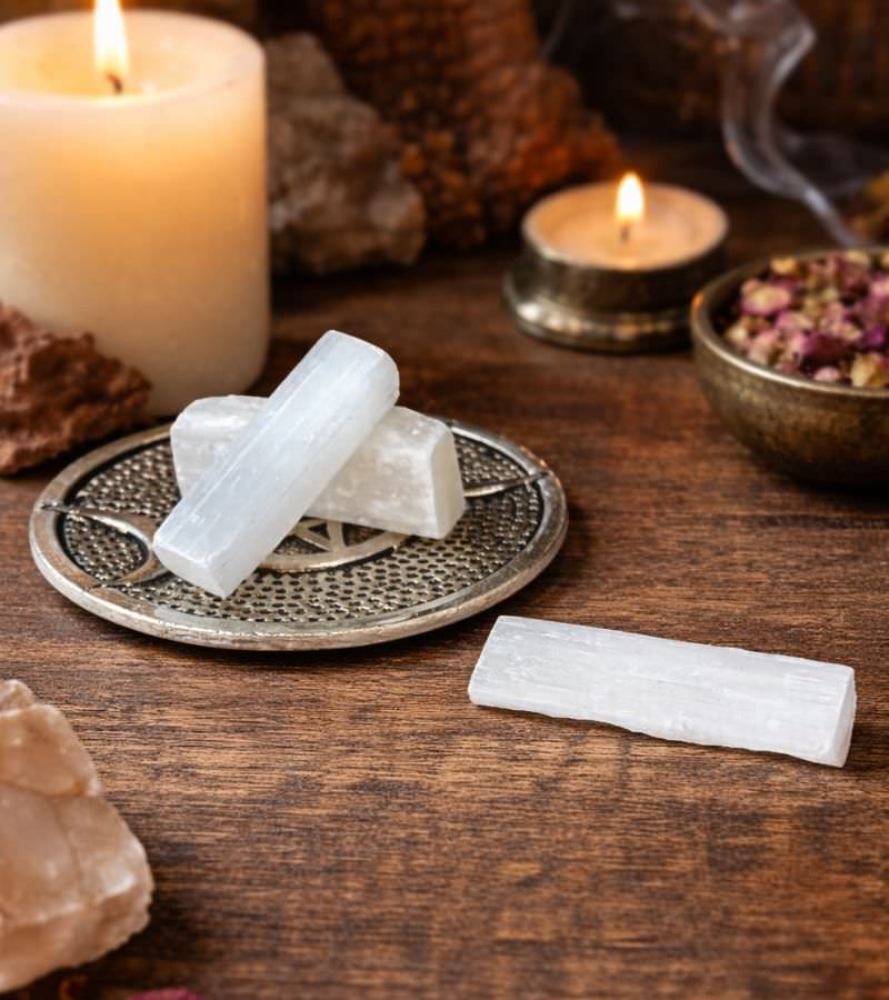 Selenite is a powerful stone with a very fine vibration. It opens and stimulates the crown and higher crown chakras. It purifies and cleanses the aura, and protects one from negative influences. It instills deep peace, making it highly effective in meditation or spiritual work. Selenite assists spiritual insight, clears mental confusion, and aids one in seeing the deeper picture. It can be used to form a protective grid around a house, creating a safe and quiet space that does not allow outside influences in. It can also be placed in a workplace to ensure a calm and peaceful atmosphere.